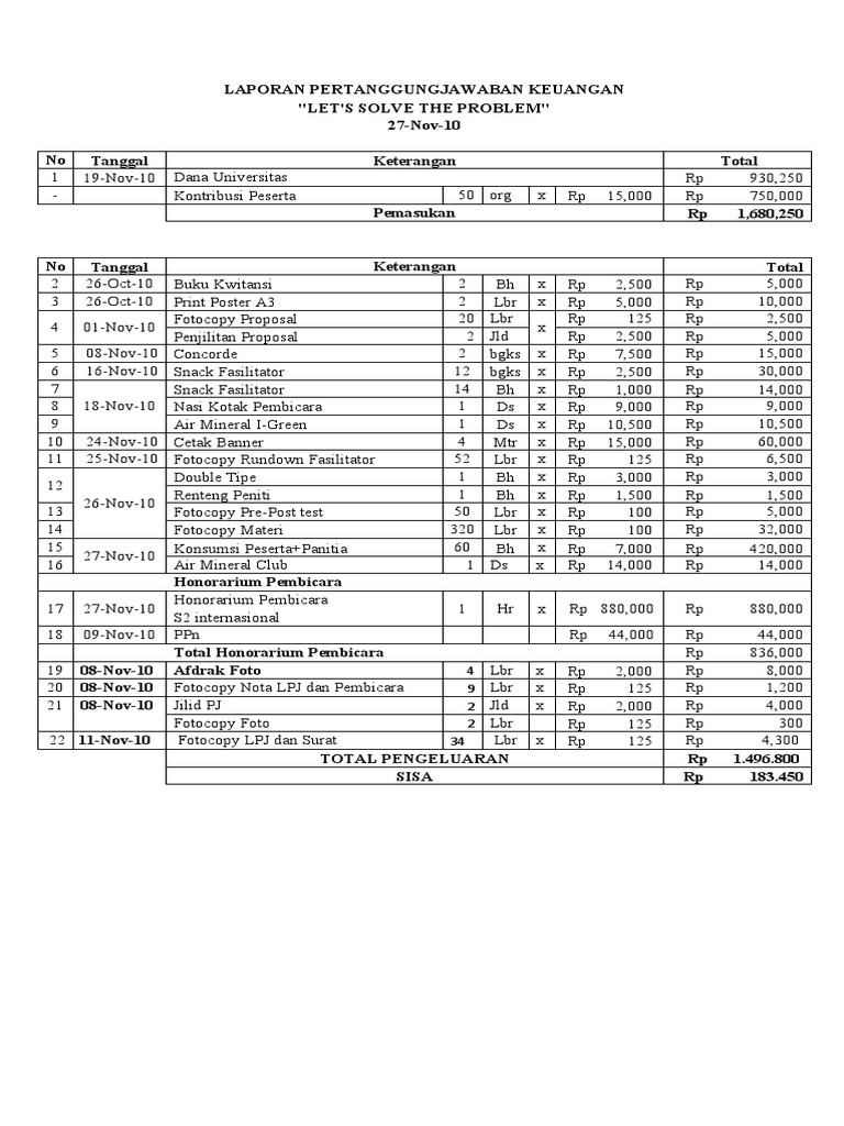 Contoh Laporan Pertanggungjawaban Penggunaan Dana Hibah ... from imgv2-1-f.scribdassets.com Maybe you would like to learn more about one of these? Contoh surat pengantar laporan pertanggungjawaban keuangan. Check spelling or type a new query. We did not find results for:
